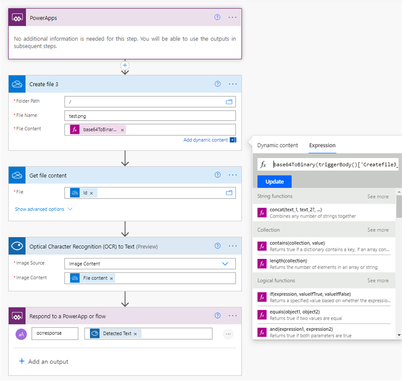 Send the file content of the recreated image to the Computer vision API and send back the response to PowerApps.