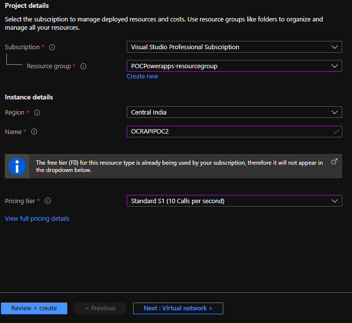 Fill in the required fields and click on "Review + Create".