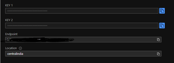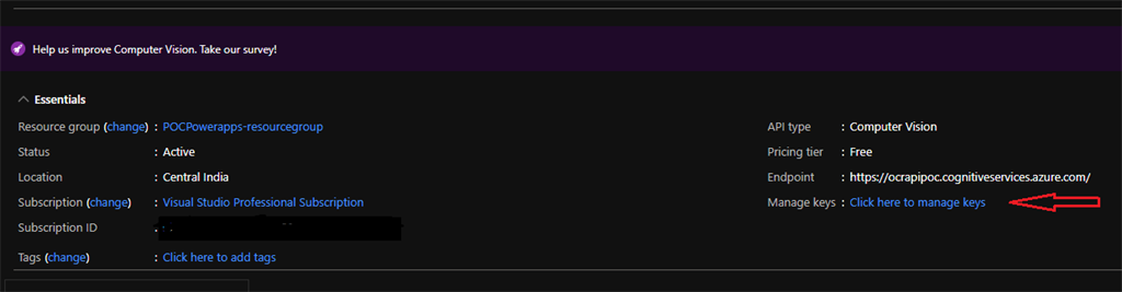 Once the services are created, click the "Manage Keys" link to get the keys for the created resource.