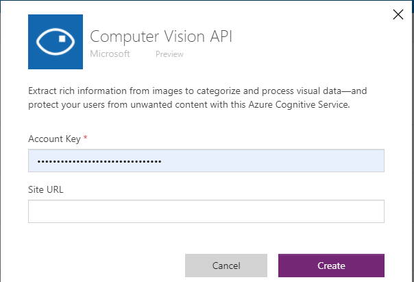 Enter the key of the created computer vision API and the endpoint URL in the dialog box and click on create to create a new connection.
