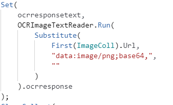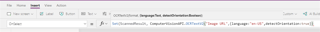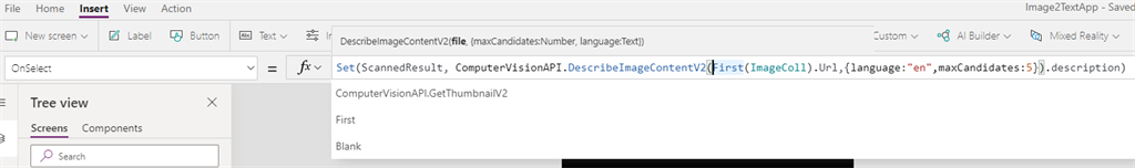 Add a button control, OnSelect function paste the following "Set(ScannedResult, ComputerVisionAPI.DescribeImageContentV2(First(ImageColl).Url,{language:"en",maxCandidates:5}).description)"
