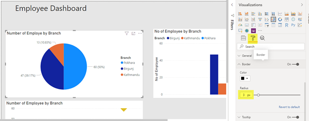 Borders add good looking to design in the dashboard. To add a border on visuals-> select visuals in which you want to add a border. Then go to format, turn on Border and choose the color of the border and give the radius of the border.