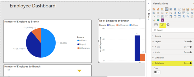 Visual with data displayed in it provides clear insights to the user. To show data in visual, select visuals and go to format. Then go to Data labels and turn it on.