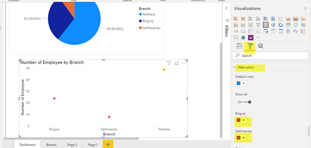 To change the color of data represented in visualization, go to Format then go to Data colors and choose your favorite color or color according to your customer's needs.