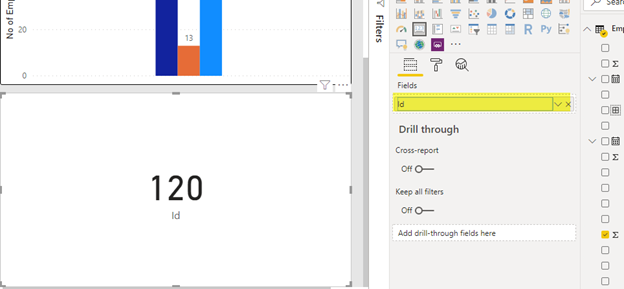 Then drag the column which you want to show on the card. In my case, I want to show the total number of employees in an organization, so I am going to drag ID to Field.