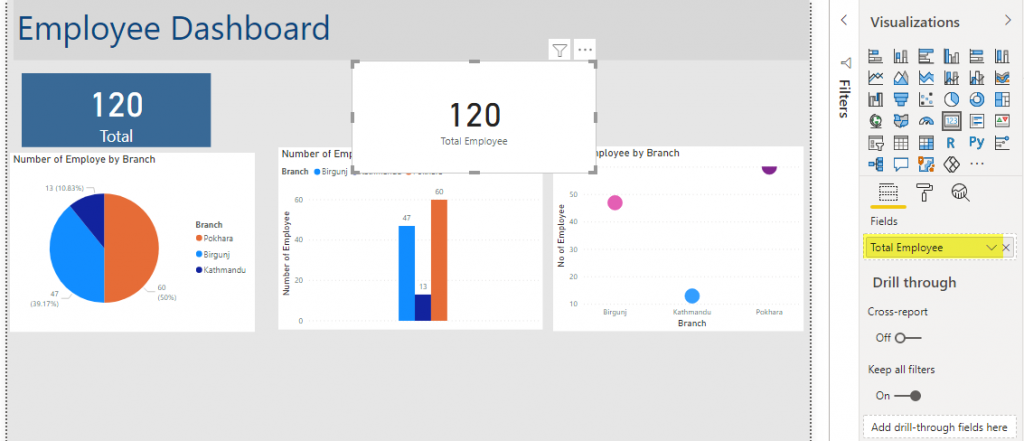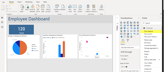 Alternatively, we can use the DAX function to get the Total count of Employees and the number of employees in each Branch. Data Analysis Expression (DAX) consists of a library of functions and operators which can be used to build formulas and expression in Power BI.