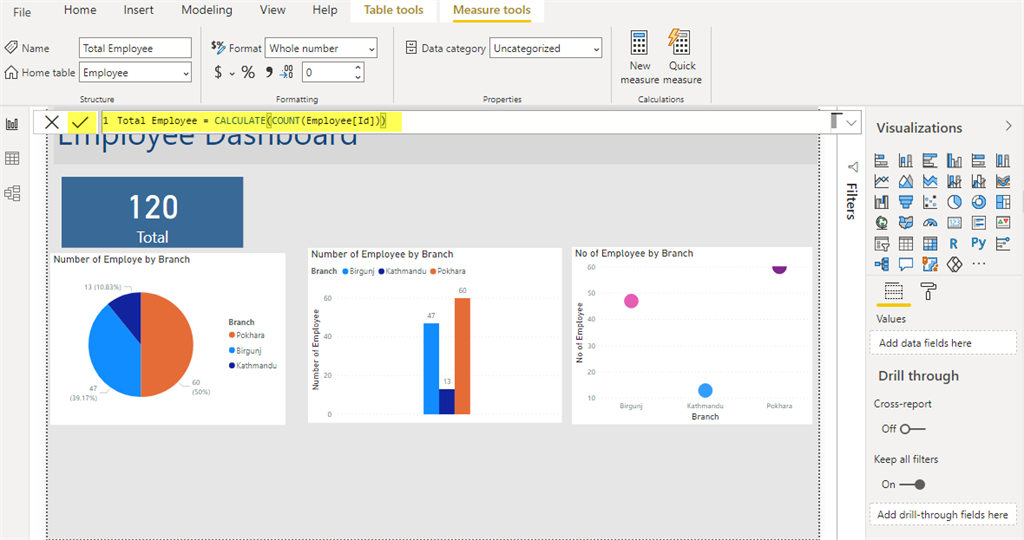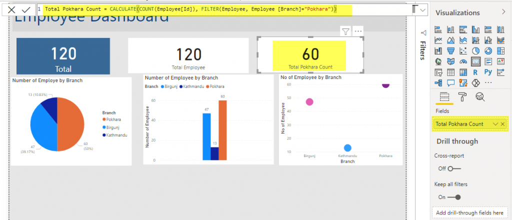 - Total Pokhara Count= CALCULATE(COUNT(Employee[Id]), FILTER(Employee, Employee [BranchName]="Pokhara"))
