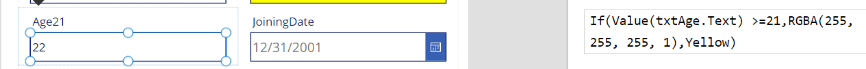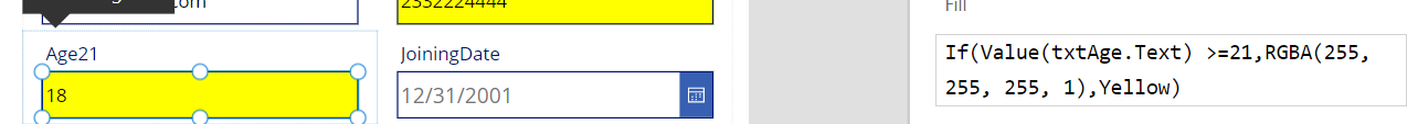If(Value(txtAge.Text) >=21,RGBA(255, 255, 255, 1),Yellow)