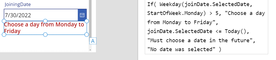 joinDateErrorMessage.Text as well as joinDate.Tooltip: If(Weekday(joinDate.SelectedDate, StartOfWeek.Monday) > 5, "Choose a day from Monday to Friday", joinDate.SelectedDate <= Today(), "Must choose a date in the future")
