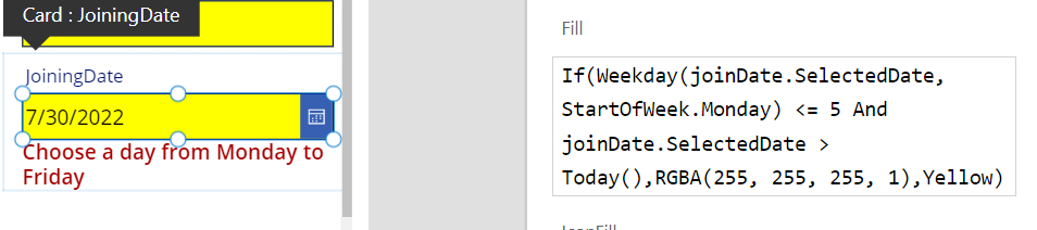 If(Weekday(joinDate.SelectedDate, StartOfWeek.Monday) <= 5 And joinDate.SelectedDate > Today(),RGBA(255, 255, 255, 1),Yellow)