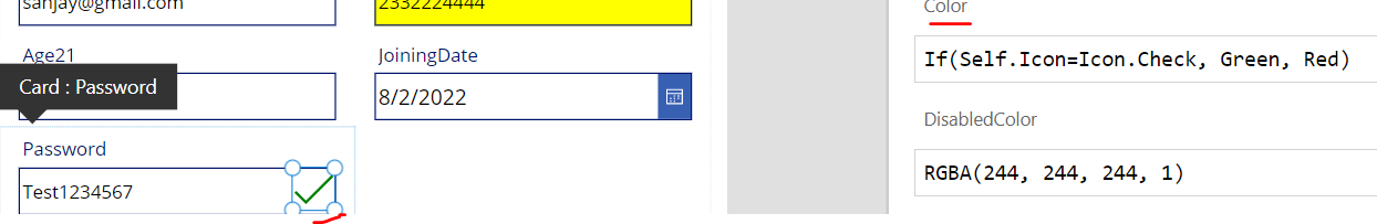 Select the Password textbox. Insert a check or any icon in the text field. Set it at the right corner. In the icon property, set the formula to: