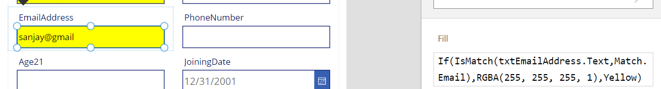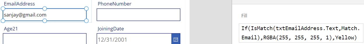 If(IsMatch(txtEmailAddress.Text,Match.Email),RGBA(255, 255, 255, 1),Yellow)