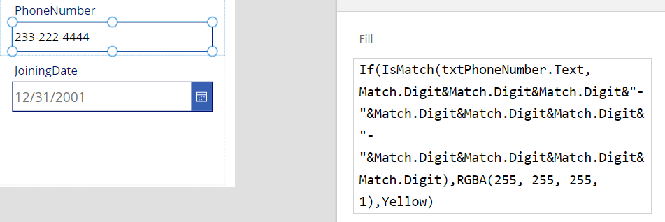 If(IsMatch(txtPhoneNumber.Text, Match.Digit&Match.Digit&Match.Digit&"-"&Match.Digit&Match.Digit&Match.Digit&"-"&Match.Digit&Match.Digit&Match.Digit&Match.Digit),RGBA(255, 255, 255, 1),Yellow)