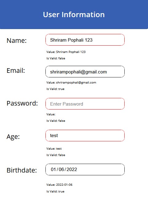 No Input needed here. This is Output value of input field data. So, if any additional validation to be applied on any submit button click event then this property value to be used. |