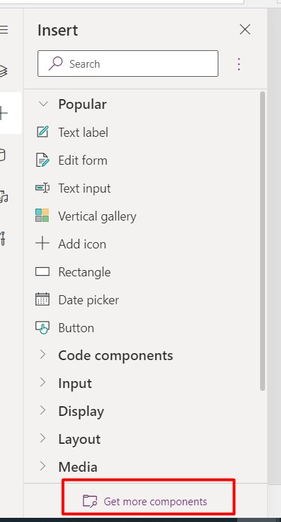Create a new canvas app for testing purpose and click on Insert “+” icon in left navigation and click on “Get more components”