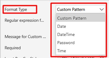 For selecting input format type from optons “Custom Pattern”, “Date”, “DateTime”, “Time”, “Password”. |