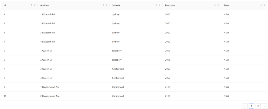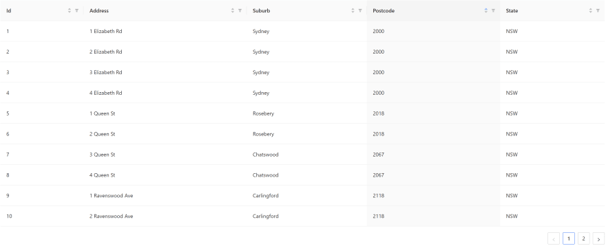 ('2 Elizabeth Rd', 'Sydney', '2000', 'NSW'),