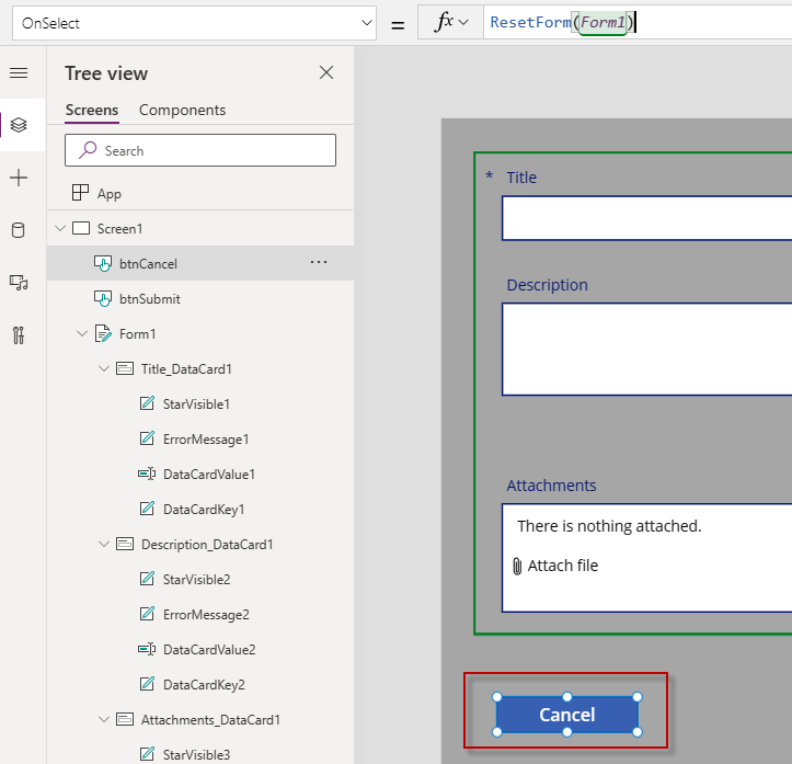 Cancel Button: Set the ‘OnSelect’ property to ‘Reset the form values’.