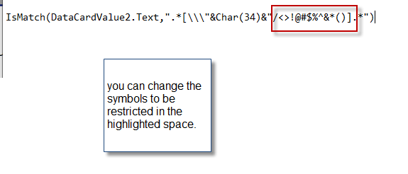 Set the ‘Visible’ property to IsMatch(DataCardValue2.Text,".[\\"&Char(34)&"/<>[!@#$%^&()].](mailto:!@#$%^&()].*)")