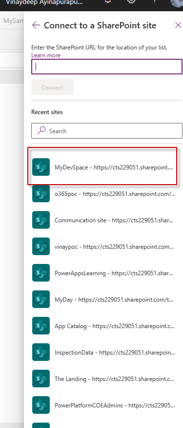 Select the SharePoint site, where the SPO list is being hosted. In this case, I am selecting MyDevSpace, where I have created the ‘MySamples’ list.