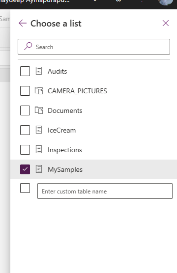 Open the form from the maker portal and search for the app ‘MySamples’.
