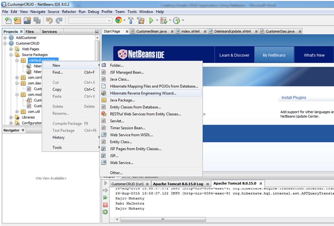 Right Click default package in the Source Package->new->choose Hibernate Reverse Engineering Wizard ->click next->choose customer table->Add ->click finish.