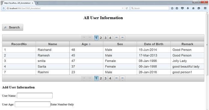 This simple application is a Create, Read, Update and Delete application operating on a ‘User’ table in ‘test’ database in MySQL Database Server. It is a Hibernate-Annotation based application.