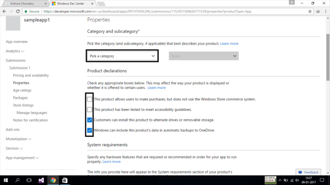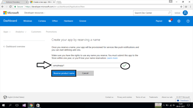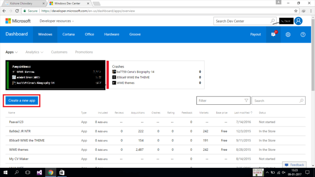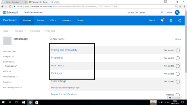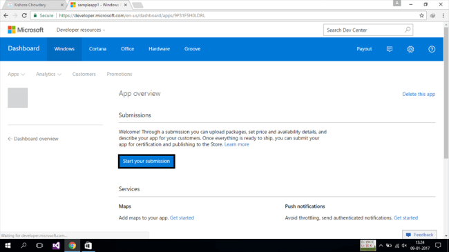 Once you sign into the Store, in the homepage, you can find details of all the applications which you have already submitted on the store. If this is your first time, then you won’t find them. Now, click on the "Create a new app" button on the homepage. This will direct you to new app creation page. There, you need to give a title for your application. Make sure that the title you give in there matches your application name. The name which you give must also be unique. If you give a unique name, you will be notified with a green tick. Once you finish the process, you will find "Start your submission" button. Click on the button to begin submission process of the application package. The screenshot gives an idea about all these.