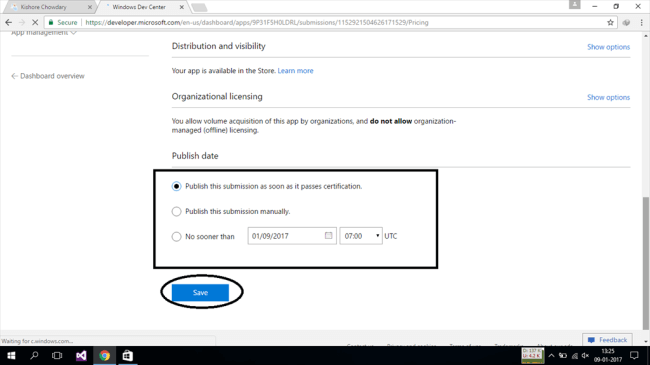 Click on the "Pricing and Availability". In the price tier, you can find details about the pricing of your application. Just select the price for your application based on your interest. You can also choose a specific date for releasing your application on the Store or you can release your application as soon as it is certified by the Store. Now, click on the "Save" button.