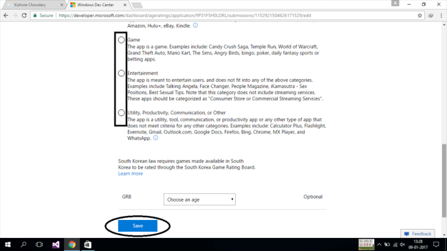 The age rating is something which will help the Store to make your application reach the people for the related age groups. You can choose your required age group for your application based on the application's functionality and content. There, you also need to select the application type. Once all of these are done, click on the "Save" option.