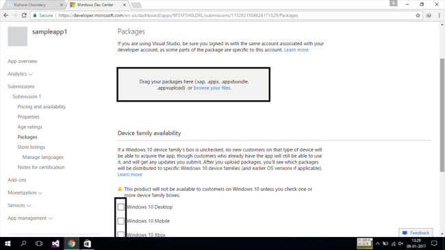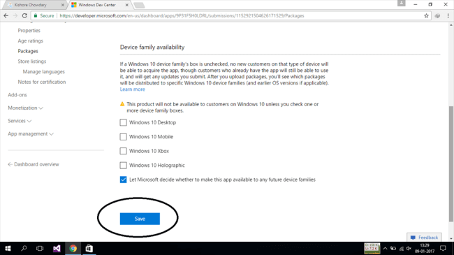In the packages place, you have to upload your application packages which you have created using Visual Studio. Browse your package and upload it in this page. Now choose the supporting devices of the Windows. Once you finish all, simply click on the save button. That’s it. You have submitted your application.