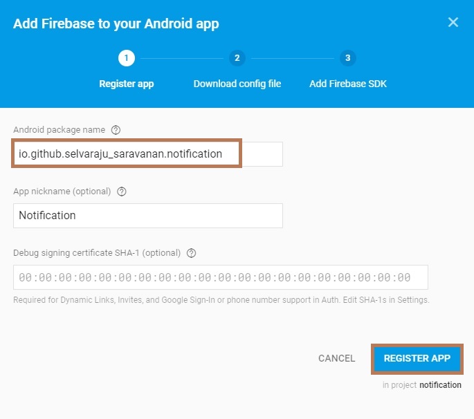 Enter your application package name and (Nick Name and Debug signing certificate SHA-1) Optional.