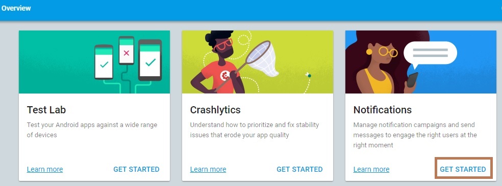 Console Firebase > Click OverView > Notification. Select Notifications and Click Get Started button.