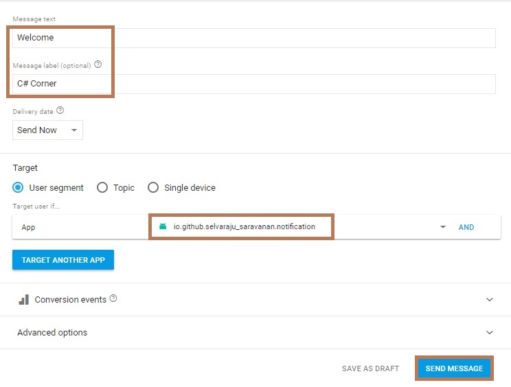 Write the information to the textbox and select your application package name and click send message button.