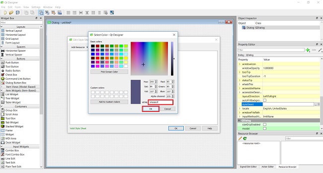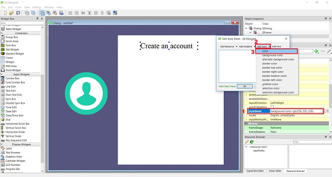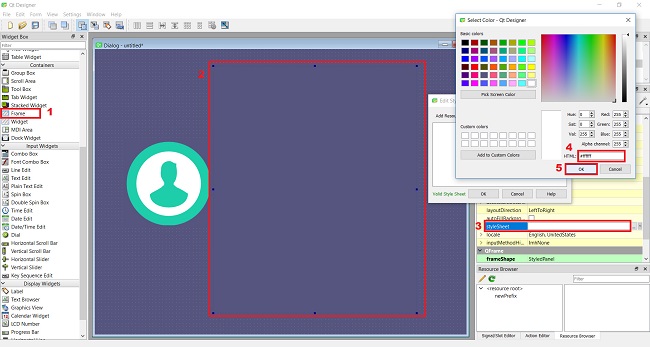 Under containers, click on the “Frame” widget to drag and drop on the QDialog. Then click on “stylesheet” under properties to choose a color for how your frame looks attractive.