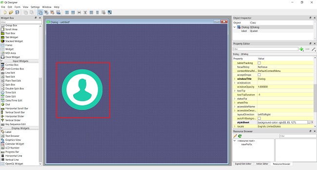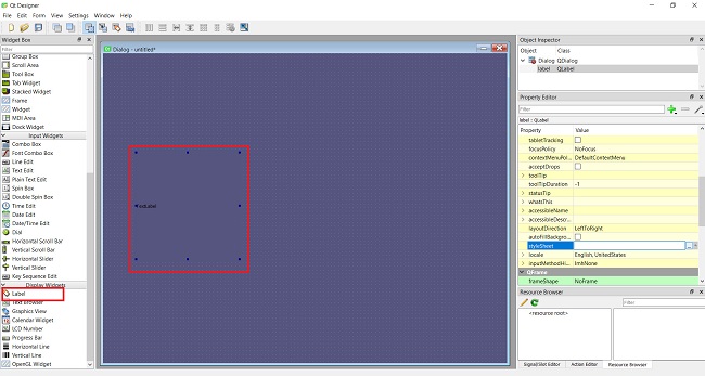 Let’s create a new label for displaying an image on the form. Choose the “label” under Display widgets and drag-drop on the Form (QDialog).