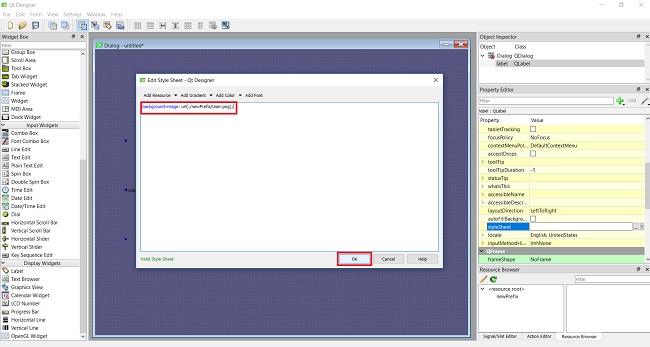 Under “properties”, we need to click on “style sheet”. Then the Edit style sheet window will appear, click on “Add resource” and choose “background-image”.