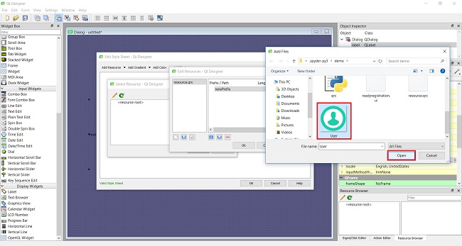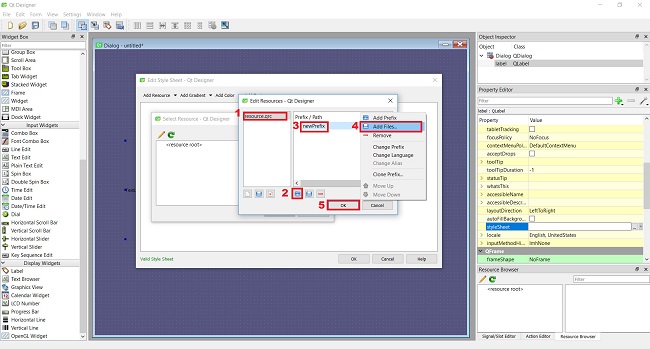 - Edit Resources >> resource.qrc >> add prefix (I will give name as “newPrefix”) >> Add Files>> user.png >> Open