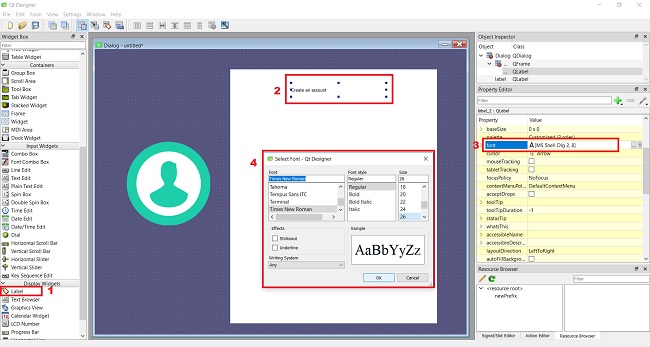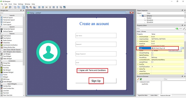 Under Display Widgets, choose “Label” to drag and drop on the Frame then change the name as “Create an account” by Font property.