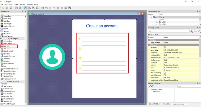 In this Registration form, we will need to create a list of fields for gathering customer information. By the way, I create four Line edits as one by one, under Input Widgets choose “Line Edit” to drag and drop on the frame.