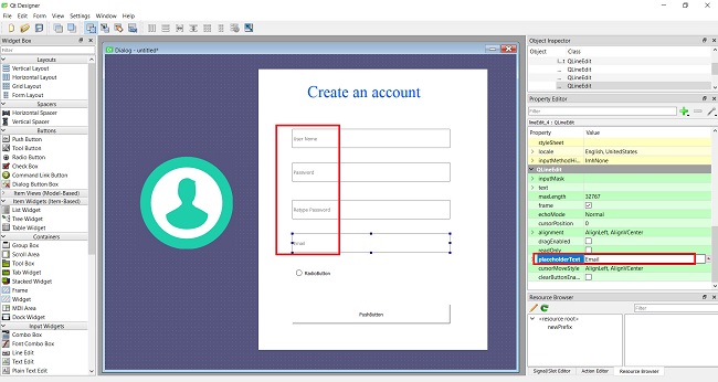 Here we need to give a name for the Line Edits that should look like hidden words. Therefore, we will use the “place holder text property” for achieving that. Then the password Line Edit will also give a feature for hiding passwords while getting input from users. In the password Line Edit, Click on the eco mode under the QLineEdit property to change the “Password” mode.