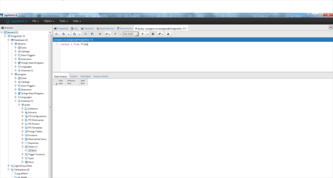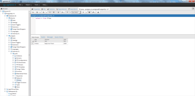 Got to PostgreSQL PgAdmin, apply select query on films table, then you will get the record like below.