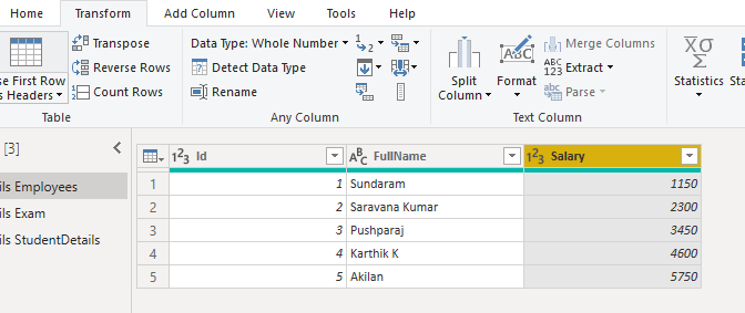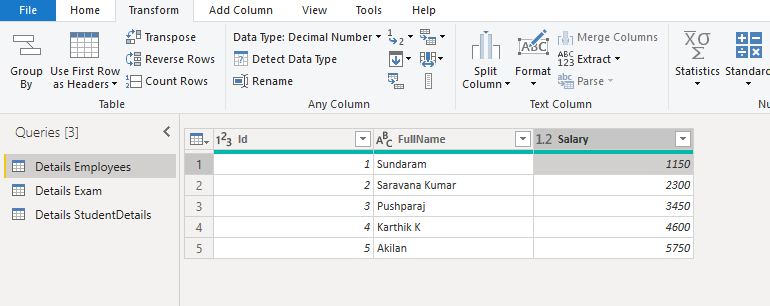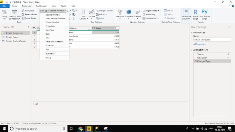 From the above example, if we look into the Salary column, its datatype is as Decimal. If we go to the Transform menu and see the Data Type, it shows the current data type of the selected column.