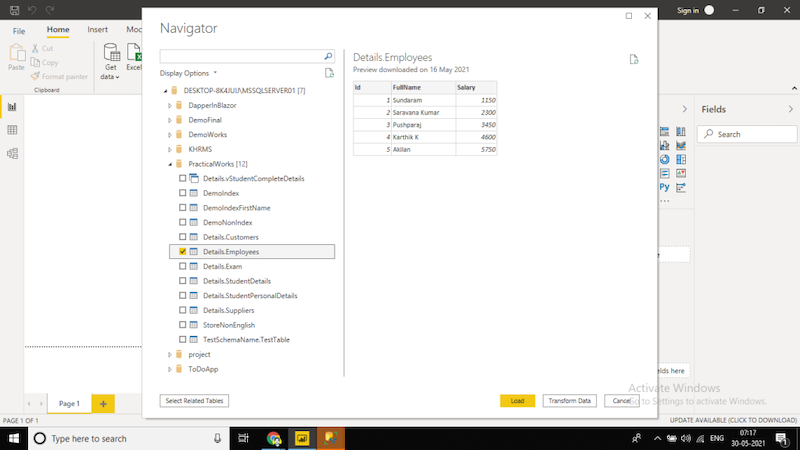 Once after connected, it will open a new window to choose the database and to choose the table. As an example, I am choosing PracticalWorks as my data and Detail.Employees as our table for preparing the dataset.