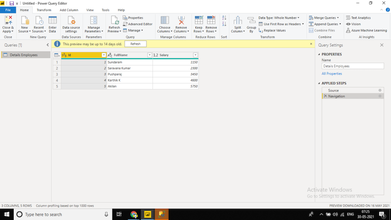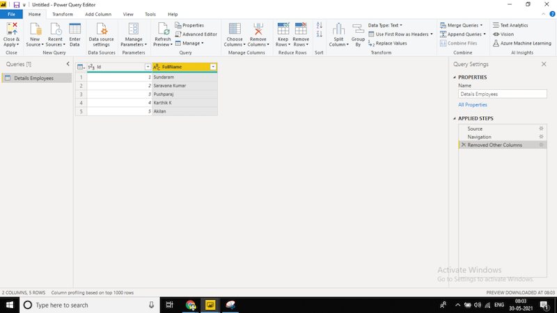 On the top left of the editor, we can see Untitled – Power Query Window. Once we save the Query Editor, then that name will be displayed over here.