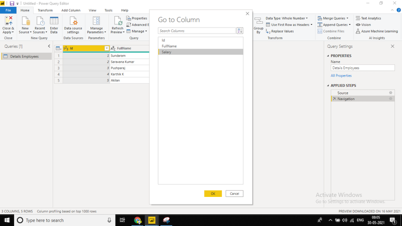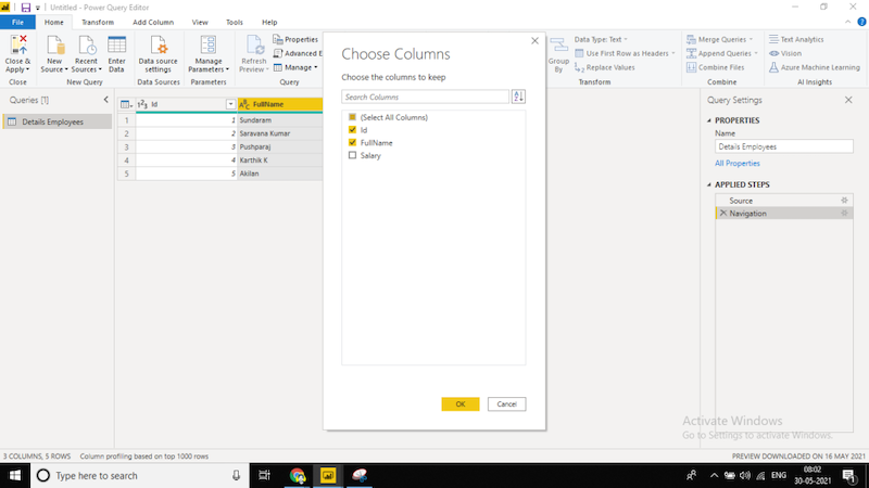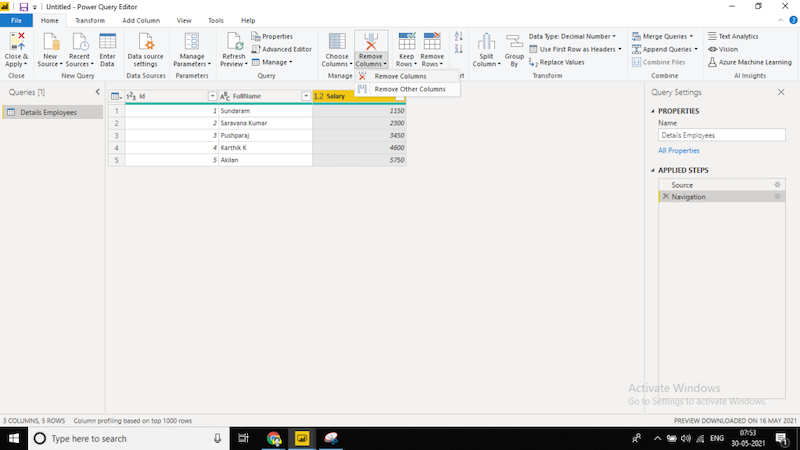 Now let’s choose Remove Column and Salary column is removed. If we look into the Applied Step on the right side of the screen, a new step is added.