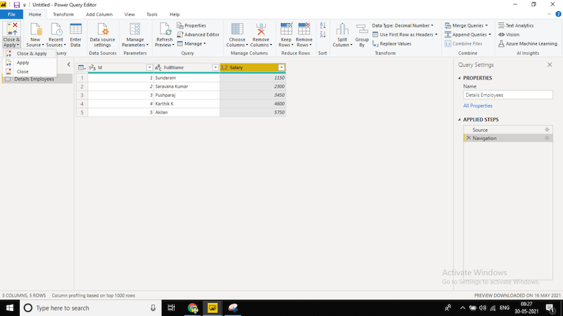 Once the data refining is done, the changes will not appear immediately in our Power BI. We have to choose the Close and Apply option from the Ribbon Tool.