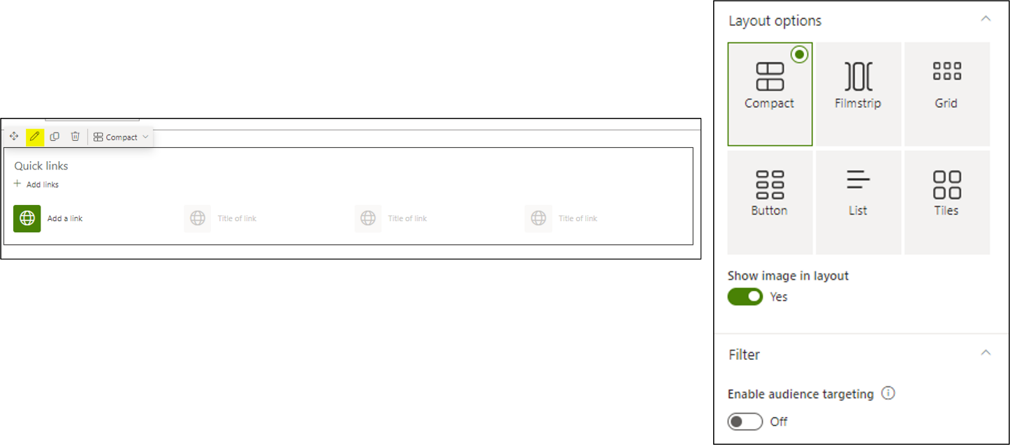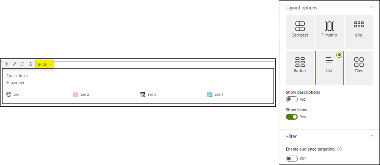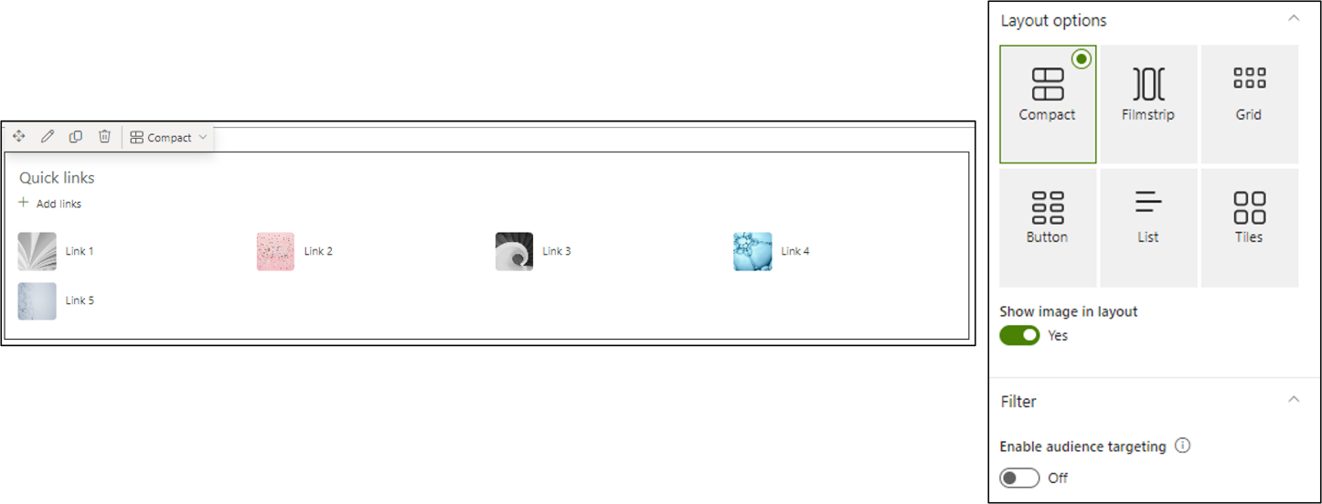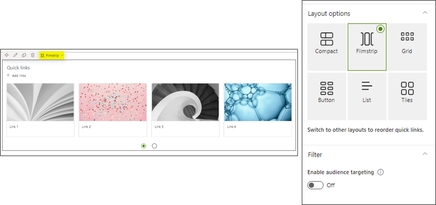 - Filmstrip: This layout in the Quick Links web part displays links as a horizontal scrolling strip of images with titles and descriptions, allowing for a visually engaging way to showcase links to various content on your SharePoint page. Quick links cannot be reordered in the filmstrip layout.