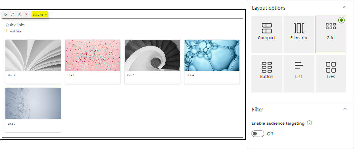- Grid: The Grid layout in the Quick Links web part displays links in a grid format with images, titles, and descriptions.