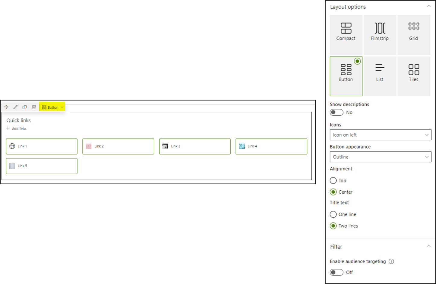 - Button: Using the Button layout in the Quick Links web part allows you to display links as interactive buttons with the option to show a description, change the position of the icon (Icon on Left, Icon on Top or No Icon), Button appearance (Outline, No Outline, Fill Color), Alignment (Top or Center), Title Text (One Line or Two Lines).
